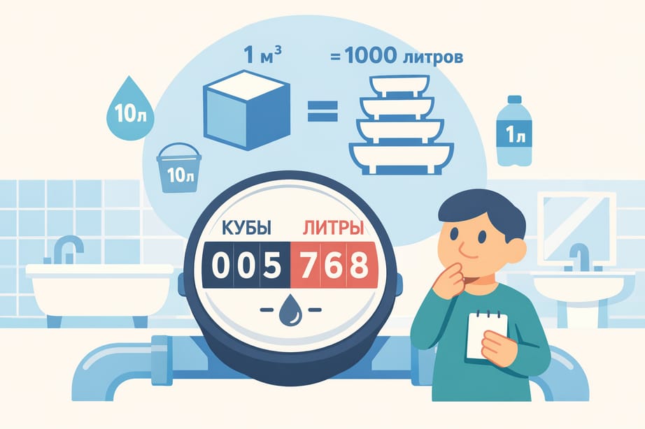 1 кубический метр воды — это ровно 1000 литров. Если вы искали быстрый ответ — вот он. Но если хочется понять, почему счётчик показывает какие-то «кубы», как их правильно читать и передавать, чтобы не получить квитанцию на сумму с несколькими лишними нулями — читайте дальше. Разберём всё по-человечески, без лишней математики.